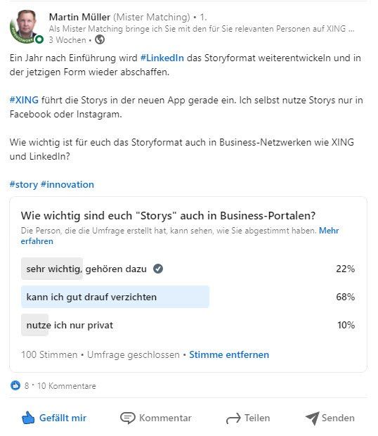 LinkedIn gefragt: “Wie wichtig ist euch das Storyformat auch in Business-Netzwerken wie XING und LinkedIn?” Nur für 22 Prozent der 100 Befragten ist das Format “sehr wichtig”. 68 Prozent der Befragten können gerne darauf verzichten.